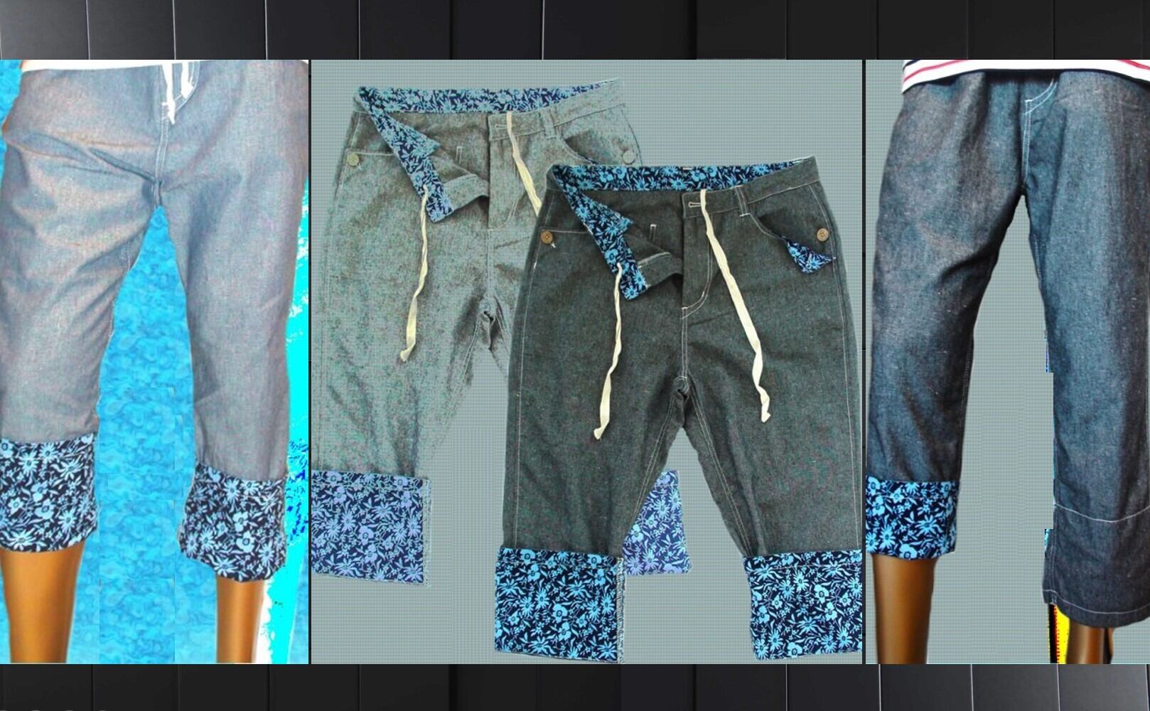 切り替え部分の花柄が鮮やかなシャンブレークロップドパンツです。