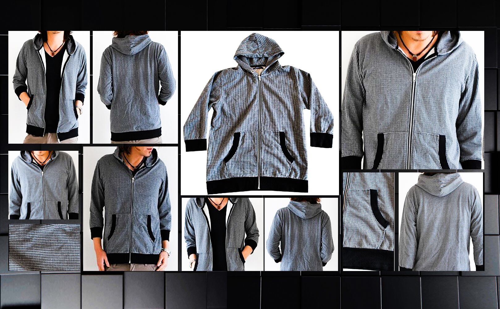 すっきりシルエットの千鳥格子7分袖パーカーです。