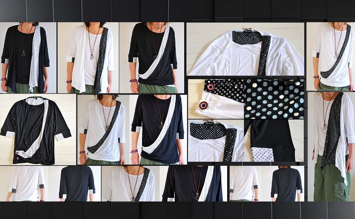 薄手の柔らかな素材を使ったカーディガンです。フロントを交差させボタンで留めるカシュクールデザイン。フェイク仕立てになっカットソーも同色です。レイヤードスタイルで部分的に使ったドット柄は箔プリントになってます。